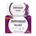 Multicentrum Mujer composición: Vitamina A, Vitamina E, Vitamina C, vitamina K, vitamina B1, Bitamina B2, vitamina B6, vitamina B12, vitamina D, Biotina, Ácido fólico, Niacina (NE), ácido pantoténico, calcio, fósforo, magnesio, hierro, yodo, cobre, manganeso, cromo, molibdeno, selenio, Zinc.