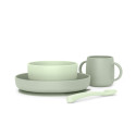 Vajilla completa de silicona suave que facilita la transición a la alimentación complementaria en bebés mayores de 6 meses. Incluye plato, bol, taza con asas ergonómicas, cuchara y mantel antideslizante para mayor comodidad y seguridad.